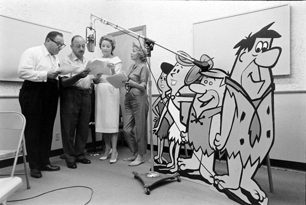 Pictured left to right: Alan Reed as Fred, Mel Blanc as Barney, Jean Vander Pyl as Wilma, and Bea Benaderet as Betty.