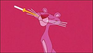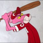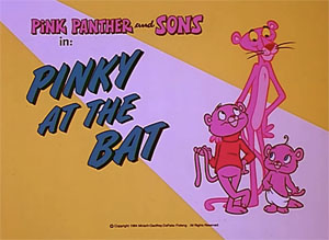 The Panther’s first appearance at the plate was in a short interstitial prepared for the NBC run of the original Pink Panther cartoons, featuring Pink batting against the Ant as pitcher, with Aardvark awaiting the ball in the field. Ant’s wind-up produces a low fast ball. While it would certainly be out of the strike zone, Pink decides to take advantage of the pitch, disappearing from the plate briefly to discard his bat, and replace it with a golf driver. A regulation golf swing, and Pink sends the ball soaring toward the outfield. Aardvark backs up, and up, until the ball lands on top of him, but not in either hand. Aardvark lies prone on his back, with the ball stuck upon the tip of his compressed long nose. A narrator states that he blew it – literally – as Aardvark snorts the ball off his nose skyward instead of hanging onto it (though I still don’t know why using his manipulative nose would not have been scored as a fair catch). Pink is rounding the bases, and the ball seems to be coming down on a trajectory to land between third base and home. Ant races toward the descending ball, while Pink races for the plate. The ball comes dwn squarely upon Pink’s head, causing him to keel over forward into unconsciousness, landing with his chin on top of Ant, who is also knocked cold.. The narrator sums up the play: “Three men out on one pitch – and one big error.” Said interstitial is second to last in a collection of such bumpers embedded below.