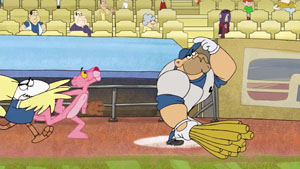 Pink finally scores a bona fide hit with Pink Me Out To the Ball Game (Pink Panther and Pals, 7/20/10). For this incarnation, Pink himself was recast back to his adolescent days, but accurately retains his original pantomime personality, and engages in dialogue-free competitions with his old nemesis, the opaque little man sometimes referred to as Bignose. Bignose and Pink both show up at the same game, in the same bleacher section, armed with catcher’s mitts, looking for a fly ball to catch. Bignose carries a display case full of previously-caught balls, needing the ball of only one more numbered player to complete his collection. He takes an instant dislike to newbie Pink, whom he views as an unwanted competitor for the needed prize for his collection. Sure enough, the desired player hits one into the stands, and both Pink and Bignose scramble to make the catch. Both come up with the ball clutched by just their respective fingertips, and engage in a tug of war over it. The ball escapes both of their grasps, and begins bouncing down the steep aisle stairwell toward the section railing. Pink races down to the bottom step, waiting to make a clean catch of the descending sphere. Bignose attempts to follow, but trips up in attempting to climb over a row of seats, himself tumbling down the stairs in a series of painful bounces. Pink makes his catch, but also catches the brunt of Bignose’s crash into him, sending the ball buncing out of Pink’s glove, and over the railing to the next deck below.