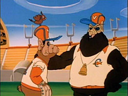 Though Pinky, who was responsible for taking the bet in the first place, is confident the Panthers can show up the Angels tomorrow, the team members are not so sure, and many attempt to feign excuses not to show up. However, Pinky thinks they just need some inspiration and a chance to brush up on their basics. This Pinky finds by talking to Dad (who of course doesn’t talk back), as Papa Pink gets the team tickets to a professional ball game to watch how the big-leaguers do it. The home team playing at the local stadium is referred to as the Ducksters – however, it becomes quite obvious who they are really supposed to be, when little Panky wanders into the dugout to attempt to get an autograph from the team manager – the real-life Tommy Lasorda! Providing his own voice-over for his animated form, Lasorda hears the pleas of Pinky and the team for some pointers, and spends most of the evening after the game giving them basic training – which seems considerably above basics, including references to the squeeze at home and double-steal.