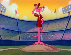 Strike Flea! You’re Out! (The New Pink Panther Show, 10/20/93) is one of those overly long, talking Pink Panther television episodes voiced by Matt Frewer (Max Headroom), which proves to be a bit better than usual, but falters as usual in the ending. Pink is a wanna-be rookie trying out for a team known as the Mutts. The Mutts’ regular pitcher (Rex D. Ball) is busy beaning batters, so Pink is given a chance to show his stuff to manager La Bamba (any similarity to Lasorda is purely intentional – even the team announcer sounds like Vin Scully). Pink winds up – and the ball dies halfway to the plate. La Bamba tells him to face it, “When you stink, you stink!” But Pink is so anxious to make the team that La Bamba finds one remaining opening for him – as dog washer for the team mascot. Rex (who has an odd split personality fixation of talking to his baseball, on which he has drawn a face and who he refers to as “Spalding”) razzes Pink on his new position, calling him a “flea agent”. Pink shrugs off the comment from the kook, just as a flea escapes from the bath water and jumps onto the panther. Pink goes into a fitful series of twitches amounting to a “wind-up”, and hurls a bar of soap out onto the field and through the manager’s hat. La Bamba begs, “Can you do that again – on the field, with a baseball, and not through my hat?”