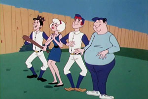 Sabrina can see a problem. She can’t very well allow Ug to become Riverdale’s new star, since he is supposed to return to prehistoric times that evening. So, perhaps something will need to be done to make sure he doesn’t perform the same way in the afternoon’s game against Crosstown High. The cartoon presents confusing continuity, failing to utilize any form of fade or cross-dissolve to denote the passage of time, and suddenly, we are already transported from the team’s practice game to the real game againt Crosstown in progress. Ug comes to bat, while, from the stands, Sabrina begins putting hexes on the ball, casing it to zig and zag, and to burroe in the ground like a gopher before rising to cross the plate, resulting in a strikeout for Ug. Riverdale’s coach begins to develop fainting spells, much as if someone switched his star player for a no-talent ringer. This goes on throughout the game, Sabrina’s magic leaving Ug hitless. Archie’s bat, however, keeps Riverdale on the boards, and the bottom of the ninth finds Riverdale behind by only a run, with one man on base, two out, and the potential winning run coming to the plate. But whose turn at bat is it? Ug’s. The fans boo loudly as a weary and dejected Ug trudges to the plate. Sabrina realizes her magic has been pretty hard on Ug, and that there must be some other way to get Ug off the team rather than messing with his natural playing abilities. So, she decides to let Ug take this at-bat without interference. But Ug is still too down-in-the dumps about himself, and lets two pitches sail by without even lifting his club. Sabrina sees that Ug has lost his confidence, but knows she can’t just hex him to hit, as that would be cheating in Riverdale’s favor. Thus, she waves a Riverdale pennant, and loudly shouts to Ug from the stands that she believes in him. This is enough incentive for Ug to change his mood, and acquire a grin of determination across his face, as the last ball sails toward him. WHAM!! A shot taken from outer space shows us the baseball, spiraling out of Earth orbit and heading for space, the final frontier.