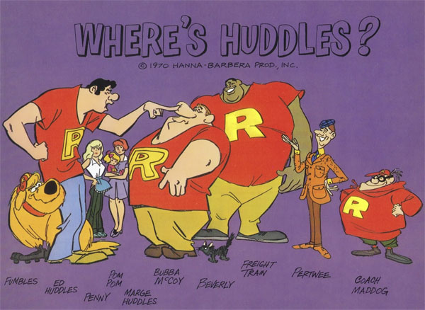 “Where’s Huddles?” was a standard family sitcom centered around a professional football quarterback for the Rhinos, Ed Huddles, and his neighbor, Bubba McCoy. Marge Huddles and Penny McCoy were their respective spouses. Mad Dog Mahoney coached the team, which also included Freight Train. Sarcastic neighbor Claude Pertwee supplied nasty comments to all. Rounding out the crew was Huddle’s baby daughter Pom-Pom, The Huddle’s requisite dog Fumbles, and Pertwee’s unfriendly cat, Beverly.