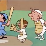 But the story has a happy ending. The Babe is at bat again inside the stadium, and a home run is launched over the wall and out of the park, landing within reach of the boys. Well, there’s a ball – but what about the autograph? The boys don’t even have to try to get back into the park for the signature, as they find the ball already has one. Babe promised to hit them a homer, and apparently saw their ejection – so made good his promise by sending them what they needed – via his own brand of air mail. The ball is returned to the present, and placed atop the trophies. The coach is pleased, observing that they somehow managed to clean the ball up too without hurting it. Rufus makes a quick visit to see that everything s okay with the boys, and remarks, “As Yogi Berra used to say, ‘It ain’t over ‘till it’s over.’” One of the boys delivers a curtain line, fully revealing that Hanna-Barbera was indeed behind the production: “And as his little buddy Boo Boo used to say, ‘What’s for lunch, Yogi?’”