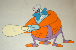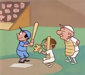 Cat’s turn at bat arrives. He has been hitless all day as usual. But, in dropping his bat, Cat bends over to retrieve it, and accidentally hits the ball with his tail. Cat is so unused to having the opportunity for base running, he at first runs the wrong way, toward third. By the time he gets turned around, the All-Stars are “laughing their heads off” – literally – as they seem to be part-robotic, with the upper half of their heads detaching at the jaw line and falling to the ground, leaving them temporarily eyeless to make the tag on Cat. Cat manages in a shuffling walk resembling Marvin the Martian to sneak his way between the legs of the second baseman, and around the third baseman, and finds himself heading for home. The third baseman lifts the baseline off the ground as if it was made of rope, and gives it a lifting pull upwards, sending a wave generated through it.