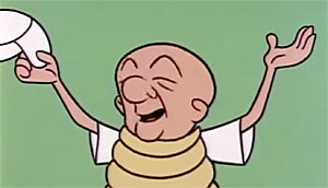 We begin this week with an oversight from the 1960’s – and why not an oversight, considering that it’s Mr. Magoo. Base on Brawls (UPA, date unknown, circa 1960-62) finds Magoo on one of his usual jaunts through town, when he encounters on the street two sewer workers, oddly preparing rivets for use underground. (?) One of them in a manhole calls to the other at a rivet heater, “Throw me a hot one.” Magoo jumps to the typical presumption that these are neighborhood kids playing baseball – but sadly, forced to play in the street, having no formal place to play. Civic-minded Magoo decides to renovate a vacant lot into a ball park for the kids – not realizing the lot he is choosing is the site of the beginnings of construction of a skyscraper by his rich but evil uncle, Tycoon Magoo. Learning of his nephew’s activities, Tycoon calls upon his British manservant Worcestershire to evict Magoo from the lot permanently.