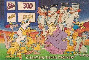 After one full inning, the All-Stas have been held to 99 runs on 67 hits, with 13 errors by Earth. A musical montage continues to show the All-Stars chalking up hundreds of runs, with Earth still scoreless. Silvers assists in the cheating, aiding the All-Stars with a trap-door under one of the bases (delivering the advancing Earth runners by chute back to the dugout), robotic feet out of the baselines to trip runners up, and a brick wall rising out of the sand just before home plate to prevent the Beaver from scoring. The eagle once again declares to the Beaver that it’s time to show these guys that they can cheat back, but the Beaver holds firm that they can’t do so. The Commissioner, seeing things going so far contrary to the advance hype raised for the Earth team, calls a time out, and addresses the Earthlings at the dugout, asking why they’re not giving the All-Stars much of a challenge. “Because they cheat”, responds the Beaver, who says Earth players follow the rules. The Commissioner responds that their league teams haven’t followed rules for hundreds of years – indicating that their methods must be more advanced than those of Earth. The Beaver reaches the breaking point when even the stadium announcer (a character who is half-man, half-microphone), asks them why they will not cheat. Yelling into the microphone man, the Beaver responds, “Because cheaters NEVER PROSPER!!!” Spontaneous laughter rises from everyone in the stands, on the opposing team, and even from the announcer, who remarks to the listening audience, “You heard it here first, folks!”
