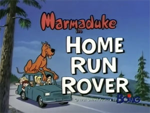 The premiere episode of “Heathcliff and Marmaduke” foretold that the screen career of the gangly comic strip hound would be short-lived. Home Run Rover (Ruby-Spears, 9/12/81) has Marmaduke allowed to attend a little league game as the team mascot. He of course makes the expected nuisance of himself, running onto the field at the call of “Play ball”, attempting to prevent a runner from stealing a base (thinking he’s a thief), by chomping onto the bag and playing tug of war with the runner until the bag rips, and even pantomiming argument with his owner as umpire over a call. Available copy of the film contains two downloading glitches where scenes of the episode are missing, so it’s not entirely certain how the team for which the hound roots loses its putcher – but somehow, for lack of a substitute, Marmaduke is called upon to pitch, with his tail. Most of the baseball action uses old hat, time worn gags (ball makes hole through glove, toss a kid into air to make a catch, whirling corkscrew pitch that makes batter’s eyes roll), finally ending with another oldie, as Marmaduke bats a single, then has to push one of the family kids from first to second, placing himself off the base. But he avoids being tagged by using the old Terry bit of digging a tunnel under the baselines, to get himself and the child underground to home plate for the winning runs. There are no genuine laughs here, and no points for originality. Another Scooby Doo, Marmaduke was not.
