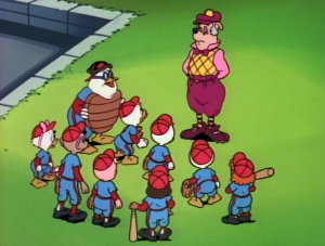 The kids tell Duckworth he needs to show up in a uniform. The best Duckworth can muster up is his old golfing outfit. The Beagles’ team is already on the field, completing warm-up. Ma Beagle, upon seeing the new Coach substitute, remarks that at first she was worried at the thought of someone new coming in – but this one looks even more stupid than Launchpad. The Brats head for their dugout with exchange of banter between them as to how they’re gonna “murderize” these guys, and Duckworth, hearing milder but similar-themed reactions from his own team, resolves that his players must be taught some lessons in the fine art of manners. This becomes a stronger resolve when Duckworth observes one of the nephews trying to “steal” a base. Duckworth steps onto the field, and orders the nephew back to first, allowing a Beagle to tag him out the second he steps off the bag. Duckworth also interferes with another of the nephews as he tries to slide into third for a triple – frowning on the duckling getting his uniform so filthy, and picking him up for a dusting while the baseman again tags him out as off the bag. Duckworth also won’t permit Webigail to engage in “climbing the fence like a monkey” to keep the Beagles’ hits from going over the fence.
