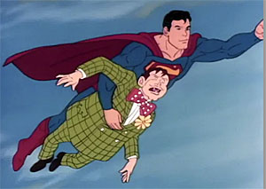 Lois insists on the assignment of covering the next day’s World Series game to watch for trouble. Clark instead chooses to cover an art gallery unveiling that night, featuring works of modern art owned by the judge who sent the Prankster up – on a hunch these might be a target for the Prankster’s weird sense of humor. Clark’s hunch proves right, and a considerable amount of footage is wasted on a chase through the museum, in which Superman seems to be allowed practically nothing super to do, standards and practices apparently preventing him from laying a blow upon the bad guys. The Prankster makes off with some paintings (providing no advancement to the overall plot), but also some artistically-designed modern robots. In a scene that amounts to nothing, the judge is seen tied to an op-art machine of some sort, while the Prankster states that he doesn’t get mad – he gets even. The Prankster presses a button activating the machine, bit what we think will amount to some sort of a death trap does absolutely nothing but to vibrate the judge like a coin-operated hotel bed.