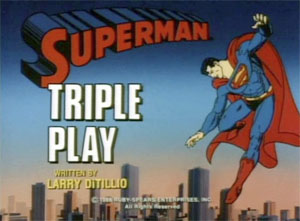 With the judge rescued, but the crooks escaped again, the scene changes to the World Series’ game next day, where Superman, for rescuing the players the previous day, has been asked to throw out the first pitch. Lois and Jimmy cover the event, while Clark dodges out on the pretense of obtaining refreshments for all, allowing him to show up in cape on the field. Suddenly, the unthinkable (and entirely unexplained) happens. A ray emits from the location where the Prankster’s thugs had been working on installation, and suddenly, the two teams, the playing field, and Lois and Jimmy thereon, all vanish into thin air, before Superman’s eyes. They materialize as if from a transporter of the starship Enterprise upon a remote island, where the Prankster has set up his own personal baseball diamond. The Prankster orders one of his minions to send word to Superman inviting him to this little party – but to come alone.