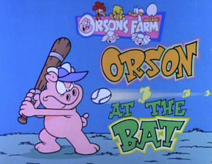 Orson at the Bat (Film Roman, U.S. Acres (from “Garfield and Friends”), 10/12/91) is a rather clever revisit to the verse of “Casey at the bat”, with considerable rewording, updating and revision to accommodate the barnyard cast of the show as players in the event. Cowardly Wade the Duck has turned down opportunity to play in the barnyard team’s sandlot game, preferring instead to borrow Orson’s copy of the famous poem from his library of books for reading purposes, and reminding Orson that even hopscotch is a sport on Wade’s personal “highly dangerous” list. Orson is a bit upset at receiving the assignment to play right field in the game, where nobody ever hits, but the team responds that someone’s got to do it. Of course, they also mutter among themselves that Orson will be out there daydreaming again before the first inning is over. Sure enough, Orson divides his attention between eating a candy bar to keep his appetite under control, and daydreaming about the poem Wade borrowed. He is so lost in his thoughts, he fails to hear the shouts of his teammates, as a long fly is actually hit to precisely the spot where Orson stands, and bops him on the head unheeded, knocking Orson cold.