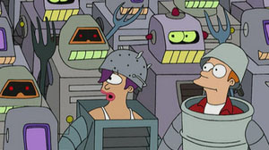 Fry believes he’s getting the hang of this game, relating to Leela, “The blerns are loaded, the count is three blerns and two anti-blerns, and the infield blern rule is in effect, right? Leela responds that, except for the word “blern”, what Fry just said was pure gibberish. Then things go crazy on the field. A batter hits the ball into a hole in the middle of the outfield. A display on the scoreboard reads, “Third Ball Locked”. The excited announcer calls out, “Multiball!”, as three launching devices pivot up from the infield grass, and shoot additional balls at the plate. The batter hits ball after ball into the field, and the fielders scatter everywhere trying to catch them. The batter hops upon a souped-up motorcycle (closely resembling the light cycles from Disney’s “Tron”), and roars around the bases, narrowly avoiding explosions just after he crosses each bag. The announcer shouts in the manner of a soccer announcer, “BLERNNNNNNNNnnnnnnn…..” as the motorcycle crosses home plate. All Fry can do in reaction is scratch his head.