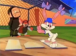 Buster selects a bat from the “Bat Boy”, who is something of a look-alike to Batman, with a rack of bats concealed behind the bat-emblem prominent upon his chest. Arnold again appears with the limousine, and drives Buster all of five feet from the dugout to home plate. Buster removes from one hand an impossible series of batting gloves, including a boxing glove and a knight’s metal glove with mace and chain attached. The poem begins to follow the original verse from here, with Buster ignoring one of the pitches while taking a call from his stockbroker to sell his bonds and invest in CD’s. A cute touch is added to the line when Sylvester states, “the multitude was awed”, as everyone reacts with a verbal “Awww….” as if viewing a cute puppy. Finally, the pivotal third pitch. The usual “somewhere” verse, and a return to the ball park – where Buster has – hit a HOME RUN??? Buster addresses the camera, pointing out he is the star of the show. You expected him to strike out? Babs appears again as a reporter, mimicking popular television commercials for Disneyland, and asking celebrity Buster what he’s going to do now after winning the big game. Buster holds up the sack of cash that he’s earned, and announces “I’m gonna build my own amusement park!”