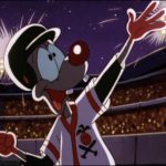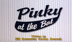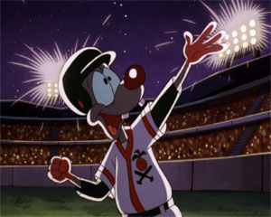 Pinky At the Bat (Warner/Spielberg, Pinky and the Brain, 11/22/97) – Quite a bit of a stretch (not necessarily of the 7th inning variety) in the usual plans to take over the world for the megalomaniac rodents this time. Brain’s latest scheme is to disrupt world economy by preventing people from spending money, by enveloping the world in a leather-repelling mist to keep them from reaching for their wallets. Pinky questions this plan, wondering what happens with the people who have vinyl wallets? Brain has no concern over this detail – people with vinyl wallets by definition have no money. The one catch to Brain’s plan is that he needs to be at the right place at the right time under the right atmospheric conditions, in order for his mist to properly disperse and envelop the globe. By his calculations, this will require him to be present at 10:00 p.m. on October 2nd, directly upon the pitcher’s mound at the stadium of the baseball expansion team, the New Hampshire Pineapples. In order to be there, Brain poses as Sparky LaBraina, offering services as player/manager, with Pinky passed off as Pinky Rodriguez. They appear before team owner George Beanstainer (word play on notorious Yankees owner George Sreinbrenner), who has just fired his existing manager in customary fashion for having three years of non-stop losses. George asks how come the mice are so small, and Brain ad-libs that they come from the Diminutive Republic. Brain lets slip a line about wanting to conquer the world – and Beanstainer completes his sentence: “Series?” That’s the positive thinking Beanstainer wants, and the mice are hired.