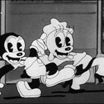The Toy Shoppe (2/18/34) – Oswald is a toymaker, operating out of a little shop. Je keeps himself busy, but eventually conks out. As Ozzie goes to bed, the toys begin a midnight parade in their best cartoon fashion. A pair of Dutch dolls are separated when an evil Jack-in-the-box makes off with the girl. The boy sets up a booby trap, painting a duplicate of his facial features upon the handle of a vice, prompting the villain to take a sock at it – and crush himself in the vice’s grip as the handle spins. Oswald awakes as the other toys assume their original positions, and discovers the wrecked Jack. Blaming it on mice, the villain is disposed of in the waste basket, leaving the Dutch dolls back together for a happy ending. Songs: “Oswald’s Toy Shoppe”, an original used as exposition at the beginning of the film, and “Toyland Follies”, a production number as the various toys cavort – sung from the sound of it by the Rhythmettes. No known recordings.