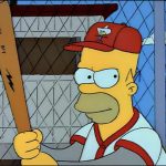 At a first game against the Springfield police squad (in a league where it is required regulation to chug a beer at every base and between most innings), Homer’s bat actually does the trick, scoring home run after home run. The disgruntled Chief Wiggams instructs his deputy to take down Homer’s vehicle license and registration. Homer’s streak continues throughout the season, until the team is one game away from taking the championship. A rival power plant owner makes a friendly wager with Mr. Burns at the country club over which team will take the championship – to the tune of one million dollars. Burns later asks Smithers if it is all right to cheat to win a million dollar bet. Smithers replies no, until Burns says, “Let me rephrase that”, changing the question to whether it is all right for him to cheat. Of course, Smithers’ answer changes to an agreeable yes.