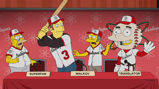 Other than Abe, the stadium, and the railing, things have changed considerably over the years. The team is in another slump, and Abe seems to be the only one in regular attendance, the stadium entirely empty except for those on the field and the announcer. But Abe notices something different today – the frustrated gutteral moans of someone in the bleachers on the other side of the field. Company? It is Moe, who, other than moans, seems to have little to say, and sits grumpily by himself. “I’ll be right over”, shouts Abe, and switches seats to join him. Abe’s overtures of friendship finally get Moe speaking, and the two begin to hit it off from their common interest in the Isotopes, and wonder at how low the sport has fallen for their team. They find a common cause in “helping” the team, by jointly razzing a pitcher warming up in the bull pen, until he becomes angry enough to begin throwing the ball around with force and accuracy (enough so to bean Moe with a fast ball). They begin to pal around in their off hours at Moe’s tavern, shocking Homer (who sees them together as the man he’ll soon have to bury, and the man whose product will soon be burying him). But their mutual concern for the future of Springfield baseball remains the root of their friendship, until they see a news item on the TV news about a European superstar from Macedonia, Aeropos Walkov (who of course hits walk-off homers, plus is a pitching find with a unique two-handed windup), planning to leave his homeland to make a break into the majors here. It is of course anticipated that every major-league team will be vying to acquire him. But Abe and Moe get the notion that no team needs him more than the Isotopes. To lure him to Springfield, Moe, who has picked up the language from his grandmother as a child, produces with the help of Abe a VHS video on an ancient gasoline-powered video camera, welcoming and inviting Walkov to come and play for Springfield, in Walkov’s own native tongue. Some inadvertent shots of unsightly or devastated areas of the town remind Walkov of his own homeland. And so, the Isotopes acquire their first real superstar.