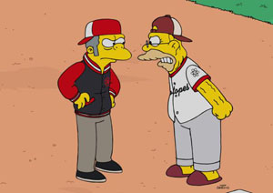 Walkov does not speak a word of English (though he tries to pick up the language from watching episodes of “Family Guy”, only seeming to learn Quagmire’s catch-phrase while woman-chasing of “giggity-giggity”).  So Moe becomes his official translator.  Abe tries to tag along on the coattails of Moe’s and Walkov’s success, but soon finds himself somewhat on the outside looking in, as massive changes take place at the stadium.   Attendance swells until the stadium is packed – and expansions become necessary.  While Abe is finally able to attend Walkov’s first game with Bart at his side, adding Bart’s name to the railing etching, the next game finds Abe’s traditional Section J transformed into exclusive luxury boxes for the filthy rich, and Section J moved to a new column of bleachers piled higher than the flight of the Duff blimp.  The JumboVision screen gas grown to where it almost dwarfs the field itself, and now it seems that everything in the stadium is decked out with sponsorship advertisement – even the basepads.  The broadcasts are as bad, with every play, and seemingly every movement of the players, sponsored by some company whose logo almost obliterates the telecast.  The final straw is when hot dogs cease to be sold by the vendors, their foodstuffs replaced with middle-European specialties.  Abe finally confronts Moe on the field, who seems to be basking in all of this, and accuses Moe of selling out instead of preserving the old game.  In a heated argument, the two break off their friendship.