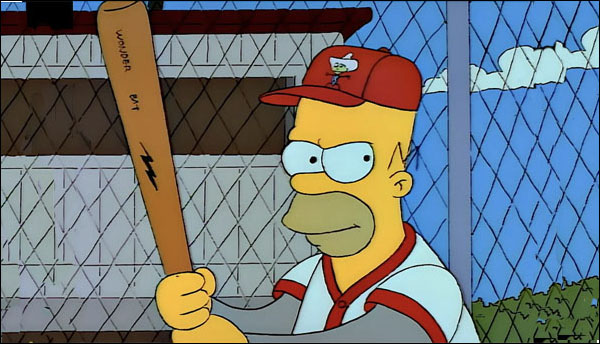 Homer At the Bat (2/20/92) moves our action to the amateur level – or so it seems.  Sign-up sheets are on the bulletin board for the nuclear power plant softball team.  Homer is first to sign, but his co-workers seem to have little interest, after last year’s 2 win and 26 loss season – their best ever.  But Homer claims to have a secret weapon this year.  The others imagine everything from spring-powered shoes to industrial laser rays, and quickly sign up to follow Homer.  In reality, Homer’s secret is merely a homemade bat carved from a branch of a tree struck by lightning, which he names Wonderbat.
