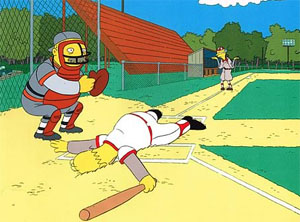 By popular demand of our readers, this week we’ll spotlight the characters of Matt Groening, with a run of episodes from The Simpsons focusing upon the local bush-league team of interest to Homer’s community – the Springfield Isotopes – or the little-league career of Bart, or, in one memorable episode, the softball career of Homer himself for the Springfield Power Plant. As a bonus, we’ll return to the 30th century, for another look at the sport future-style with the cast of Futurama.