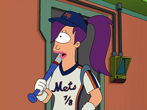 For a wrap-up this week, we’ll visit another Futurama episode spotlighting the future sport of Blernsball.  A Leela of Her Own (4/7/02) isn’t nearly as imaginative as the innovations to the sport previously shown in “Fear of a Bot Planet”, and several of the game’s changes seem to disappear from view, making the game seem more akin to traditional baseball except for the bungee tether on the ball.  A further notable change is that Fry now finally seems to understand the rules of the game, and becomes something of a tutor at it, when he and the Planet Express crew decide to help a family of immigrant aliens (from outer space, that is) assimilate to Earth culture.  Fry, being a past expert on pizza, shows them how to cook the favorite in their newly-opened restaurant to the liking of humans, instead of their own family recipes with alien ingredients that taste like vomit and produce hallucinations.  But Fry also proposes introducing them to the national pastime, via a sandlot game between the Planet Express crew and the extended alien family.  Leela acts as pitcher, though she is quickly forced to admit (being a cyclops) that she has a problem with depth perception, as she beans the lead-off batter on the first pitch.  The batter, cross-eyed from the blow, notes that he is now having trouble with depth perception too.  Leela finds, to her dismay, that all she can throw is bean balls, conking four batters in a row, and thus walking over an opposing run.  She is about to turn over the ball to someone else to pitch, but a crowd has gathered along the sidelines of the field, amused at the spectacle of Leela’s semi-lethal dead aim, and shouts for the team to leave her in.  They begin chanting the word “Bean” over and over again, as Leela repeats her unbroken streak of direct cranium hits.  Along comes the random Blernsball scout for the notoriously-losing team, the New New York Mets, who sees possibilities in Leela’s ability to draw crowds, and offers her a pitching position as Blernsball’s first female player.