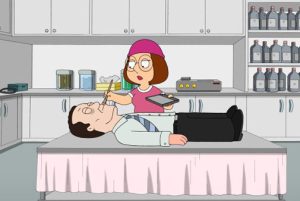 Peter discovers the foul deed as his pals inform him of their solution to their mutual problem inside the stadium. Peter rushes outside to find Chris sitting in a wheelchair in an ambulance, with his right arm in a sling. Chris makes reference to the compound fractures and the considerable pain, but is forgiving as his Dad wails about his gambling destroying his son’s pitching career. “Not necessarily”, says Chris, revealing that, when his arm had been getting tired, he had been secretly practicing with his other arm to also become a lefty. Still in his sling, Chris makes his way to the mound to start for the home team. He winds up with his free arm, and lets one fly – straight into the bleachers, where it breaks Quagmire’s arm in two. Chris’s next throw is equally erratic, if at least a little less physically devastating. Chris’s pitching, despite giving his best, leads the high school team to its most devastating and embarrassing loss ever – played honest, but leaving everyone happy, as Peter and his pals rake in the dough again instead of leaving the country to escape their creditors.