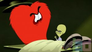Big League Beast (Warner, Looney Tunes Cartoons (Bugs Bunny), 5/27/20 – Kenny Pittenger, dir.) – On a stormy afternoon, Bugs sits semi-comfortably in his dripping-roof rabbit hole, wearing a baseball cap and an oversize foam rooter’s glove, attempting to watch a big game of baseball on a small TV set. Just as the first pitch is thrown, everything goes black and silent, except for the blinking of Bugs’ frustrated eyes in the darkness. Bugs pops his head out of the hole, and attempts to adjust some metal rods protruding from the soil next to his entrance. “Darn these rabbit ears”, complains Bugs. He wonders how he’ll ever get to see the game – until his eyes spot a venue he’s visited at least once before – the castle of the local evil scientist, straight out of “Water, Water, Every Hare”. Bugs eyes a large ray-gun apparatus on the castle roof, with a deep-dish projection plate at the rear of its barrel, and mistakes it for something useful – the ultimate in satellite dishes. A few seconds later, Bugs is knocking on the castle door, disrupting the current evil thoughts of said scientist (the Vincent Price-type who also appeared in “Water, Water”). Bugs quickly introduces himself as a fellow baseball fan, rattles off his power predicament, and barges in with a flurry of fast-talk to enjoy the game with the scientist (taking the further liberty of grabbing “refreshments” from a refrigerator, though it appears that at least some of the device’s contents are not food, but chemical potions, and a popcorn-size bucket that bears the universal symbol for radioactive materials). “And so it begins”, murmers the disgruntled scientist to himself, and climbs a staircase to a tall tower and a sheet-covered operating table, to pull an electric switch. Up from the table rises Bugs’ old nemesis, Gossamer the monster, ready to do his worst.