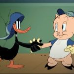 Porky, now left with only his own sagging arm, panics at what to do. If only Daffy were here. Then a brainstorm hits. If he wants to pitch like Daffy, he has to think like Daffy. Porky closes his eyes in great internal concentration, as a cutaway view of his brain reveals his gray matter shaking, trembling, then finally sprouting a duck beak which shouts, “Woo Woo!” Porky’s eyes spin within multicolor circles, and he begins to act like the lunatic duck, twirling his shapeless, rubberized arm within his opposite hand like a lariat, and letting loose with a toss, for strike two. Another “Daffy” pitch has Porky compress his ribbon arm like a coiled spring, to launch a third pitch at the plate. The batter misses for the third strike, but swings so hard, he takes off as of his bat were an airplane propeller. He soars over Porky’s head, hitting the outfield scoreboard head-on, and drilling a gaping hole through it. The impact knocks all the numbers loosely hanging from the Gorillas’ half of the scoreboard off their pins, except for the center number “0″ on the total score, while the “1″ from the Gorillas’ total falls to land on a pin on the Cutie Pies’ side, leaving the score reading Cuties 1, Gorillas 0. Daffy revives, shouting congratulations to Porky for winning the game, and the two are hoisted onto their teammates’ shoulders for a carry off the field. “High five”, the two shout to each other in unison – except Porky mistakenly uses his broken rubber-hose arm to make the impact. The arm whips around, stretches out a mile, and comes back around, tying up our two heroes together in knotted loops, for the iris out.