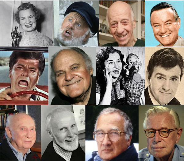 Just a few folks who made the film such a holiday treasure. (Top row from left): Shirley Booth (Mrs. Claus); Mickey Rooney (Santa Claus); Bradley Bolke (Jangle, Police Officer, Dogcatcher); Middle row: Bob McFadden (Jingle, Elf Doctor); Dick Shawn (Snow Miser); George S. Irving (Heat Miser); Rhoda Mann (Mother Nature, seen here with Howdy Doody); Ron Marshall (Mr. Thistlewhite, Mayor); Bottom row: Maury Laws (Composer, Musical Director), Jules Bass (Lyricist, Producer, Director), Arthur Rankin, Jr. (Producer, Director).