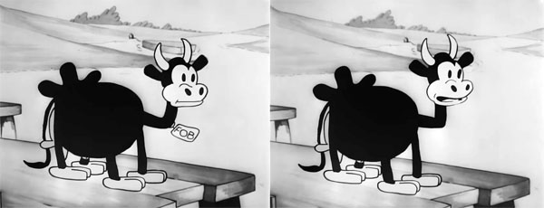 Perhaps a good place to start is what I’ll call the “Disappearing Act”. This subcategory will not include the general garden-variety of mis-tracings where some line or another fails to get transferred from pencil drawing to finished cel through minor carelessness in the ink and paint department. Such errors are far too common to categorize. Many, for example can be seen on a regular basis in lower-budgeted cartoons of the 1930’s, such as Bob Clampett’s Looney Tunes, where inconsistent lines between drawings of Porky Pig and his pals often seemed the order of the day, showing up in almost every episode. This category instead includes the more egregious instances, where entire objects, props, and sometimes characters themselves, briefly disappear from the screen. Devotees of classic animation will likely remember one such instance in perhaps the most famous black and white sound short ever made – Disney’s Steamboat Willie (Mickey Mouse, 7/29/28), where, at approximately 2:10, the cow waiting on the docks lets out with a moo, and on the inhale momentarily has the large neck tag reading “F.O.B.” entirely disappear from the shot, then reappear again.