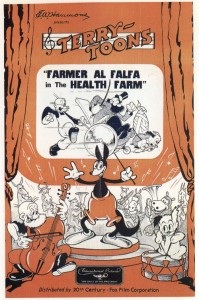 This would allow, for example, a single walk-cycle to be traced only once, without repeating drawings shifted into differing positions on each successive cel to allow a character to enter or exit a shot. But cels have a drawback for this technique. They have a thickness, and leave a visible shadow at their edges if seen by the camera. The shadow edge of one cel is bad enough, but placing two side-by-side almost doubles the visibility of the edges, producing a vertical line passing on the screen (or on rare occasions, a horizontal line if the top or bottom edge of a cel is revealed). Perhaps the technique might have worked better in the days of Fleischer paper animation, when the thinner edges of paper might have produced no more shadow than average “slash” animation techniques of cutting away at one layer of paper to reveal something on a second layer underneath. So cels again complicated the animator’s life. Typical results of the Terry cel pan can be seen in such films as A Bully Frog (9/18/36) [Click Here] at approximately 5:32 (the principal frog’s cels making an entrance across those of a female frog below, leaving a line that clearly travels across her), and The Health Farm (9/4/36) at approximately 2:36 (a shot which begins in close-up, making the entering line look even worse, then backs up to reveal Farmer Alfalfa and a bearded man who appears to have a gout-swollen leg – the characters continuing on the screen long enough to reveal another line as the trailing edge of the cels is also briefly seen). And there are many other such examples in Terry’s library.
