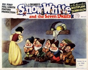 Ever try to find animation errors in Snow White and the Seven Dwarfs? (Disney, 2/4/38) Not many to come by, as the film was most likely trouble-shot over, and over, and over again before release. But one minor cel-related error occurs at approximately 31:23, involving a fancy special effect that gets away from control for unknown reasons. A complex group shot has the dwarfs investigating the intruder upstairs in their bedroom. The dwarfs are seen in their darkened living room, and light in the room is provided by a single candle, held by Doc. To accomplish the effect, the animation of the dwarfs and backgrounds are placed under a translucent gray overlay to simulate darkness, while the candle’s flame remains on a cel layer above the gray, together with a second cel layer in which a single dot of transparent yellow paint is sprayed by airbrush. The airbrush dot provides the effect of a glow around the animated flame layered above it, which seems to illuminate a small area of background and character animation seen through the dot’s transparency. A clever and convincing effect, when done correctly. But for a brief few frames, it is not. As the dwarfs realize, as put by Doc, that “One of us has got to go down, and chase it up – ah, er, up – down”, they all but one nod in agreement as to who it should be, and turn to look at Dopey. As Doc turns, his hand holding the candle lowers slightly, The candlestick below the gray layer moves properly with him, and so does the flame on the topmost layer above it. But someone briefly fails to move the dot of airbrushed yellow, which remains by itself hovering in mid-air without a source. After a few frames, someone notices, and the dot catches up with the candle in a one-frame jerk. Did the instructions for the shot fail to make a notation somewhere? Or did the cameraman fail to follow them correctly? Or were the needed cels for the movement of the dot never provided to the cameraman at all? Anybody’s guess, but another classic example of how complexity can get you into trouble if you’re not absolutely on top of your work.