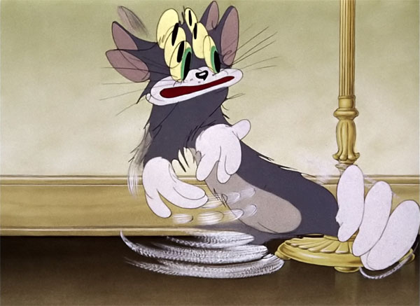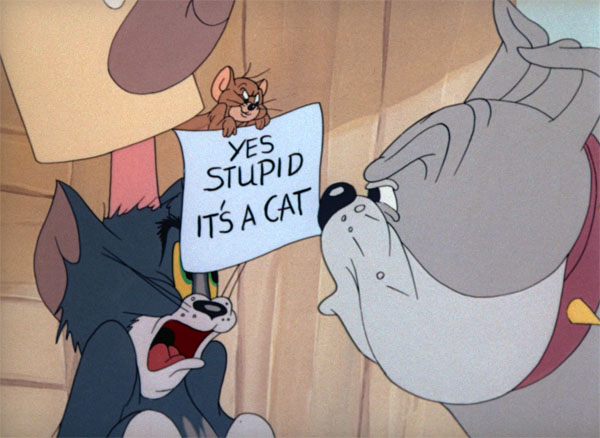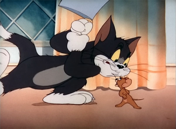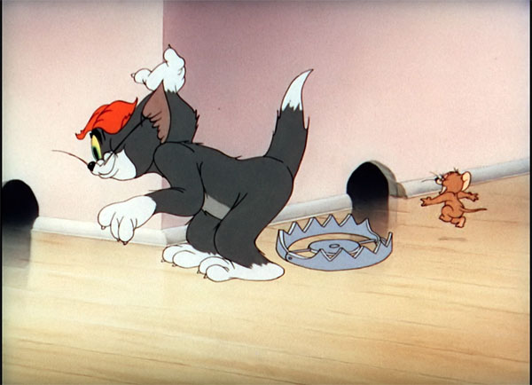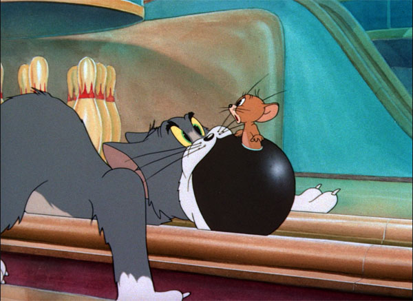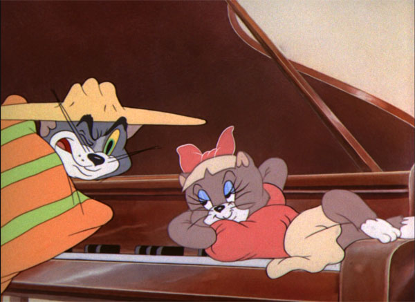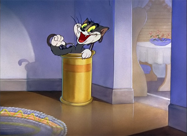 The most egregious issue with past copies, though, was that several were improperly mastered for the Tom & Jerry Golden Collection Vol. 1 in 2010 from subpar faded material (lovingly and erroneously dubbed “Metrocolor”, since these retained the black MGM lion logos from ‘60s Eastman color reissues). They were never flagged at any point in production (obviously George F. was not involved), so more than a few genuine classics (including two Oscar winners) have looked embarrassingly awful everywhere for the last fifteen years. Better source material being unavailable can’t be an excuse because all of these titles looked much better in previous collections and incarnations. Some of that has been fortunately fixed by utilizing superior sources: The Bowling Alley-Cat, Sufferin’ Cats, The Zoot Cat, The Million Dollar Cat, and Puttin’ on the Dog now look on par with the best transfers on the Tex Avery Screwball Classics discs. The rest of those “Metrocolor” cartoons, sadly, look as rotten as ever here, though technicians tried to “hide it” by getting rid of the ‘60s MGM lion, as if no one could tell the difference by what the actual cartoon looks like. (In Lonesome Mouse’s case, they forgot and left the ‘60s lion on!)