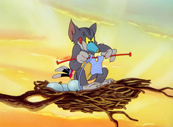 This oddball entry has Tom donning the worst drag possible to reclaim Jerry from a horny eagle. It works too well, as the cat ends up married and hatching eggs. Another uncredited Cal Howard story?