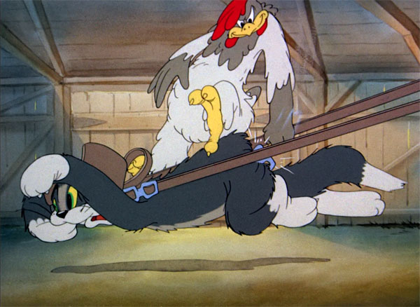 Tom pursues Jerry through the remnants of a Happy Harmony-style barnyard, where Tom and a mother hen receive quite a bit of abuse to their respective backsides.