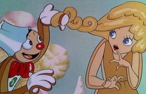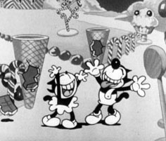 A near sub-genre of cartoons appeared during the early to mid-1930’s, possibly deriving from some animator’s sweet tooth. It was becoming a convention of animation, probably inspired by Disney’s Silly Symphonies, to venture beyond the realm of anthropomorphic animals and the wilds of the woodland, into new “worlds” where inanimate objects sprung to lives of their own, and cavorted in entire settings or communities populated by and devoted to the needs of their kind. Disney and Harman-Ising specialized in varieties of novelty and specialty shops which would come to life at midnight or when their proprietors locked up for the night. Wax museums made the rounds, spinning off from the success of Warner Brothers’ Mystery of the Wax Museum. Burt Gillett would take us to a community of clocks (Van Beuren’s Grandfather’s Clock), while Ub Iwerks would give us a colorful view of Balloon Land, and Leon Schlesinger and Friz Freleng would predict the world of Cars with Streamlined Greta Green.
