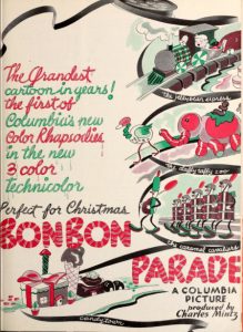 Charles Mintz produced a dandy in the wake of The Cookie Carnival, as his own first effort in three-strip Technicolor, Bon Bon Parade (Columbia, Color Rhapsody, 12/5/35). For a concept likely rushed to production within a half-year, the film is for the most part amazingly flawless, finely animated (particularly in a precision march of a peppermint-stick soldier brigade), and features both dazzling special effects and a great use of color, particularly in a spectactular fireworks display ending the film. Where it falters, however, is in other shots of candy-striping, giving away the limitations of its quality-control personnel and/or its budget for retakes. At approximately 5:08, a calliope upon a parade float is revealed, as a roof of the float rises upon four peppermint-stick poles. All four red and white poles display varying degrees of stripe-interchanging as the roof rises to full height. Surprisingly, the calliope pipes (also made of striped candy sticks in green and yellow) maintain their proper stripe positions throughout the expanding and contracting musical action of the shot. At approximately 5:26, a wild animal cage enters on a float, its bars all made of striped candy sticks. The first bar seen entering the shot glaringly shifts color about every quarter of a second, while a green and white bar in the far rear of the float, partially cast in shadow, features a repeating cel where two consecutive stripes are erroneously painted the same color about three-quarters of the way down the stick, throwing the color of all stripes below off by one line, leaving the bottom third of the pole changing color while the top remains stationary. A final error does not involve the stripes, but instead is of the voice-switch variety discussed last week, as the king of Candy Town sings three consecutive lines of a song at approximately 3:52, even though he is singing in three different voices, two of the lines properly intended for his lollipop palace guards, who accompanied him in an earlier shot.