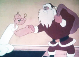For some reason, Bluto, dressed smartly in navy blues, is stalking around their house at night and decides to dress up as Santa Claus. Popeye and Olive really need to lock their windows – or at least use screens so all the termites don’t keep coming in.