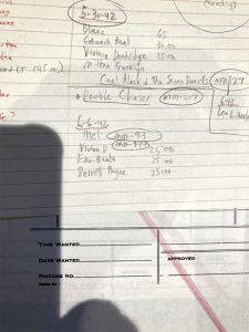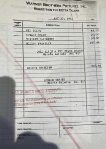 But next, check the handwritten notes from my initial research visit three years before, in 2002, when I was only permitted to copy notes from the original documents in pencil on to index cards. You can see in my handwritten scribble that another recording session, dated a week later on 6-6-42, was actually for COAL BLACK too, but on the original “REQUISITION FOR EXTRA TALENT” document from which I was making this pencil copy, somehow, they had assigned an incorrect production number – the number 977 was in fact the Chuck Jones cartoon FLOP GOES THE WEASEL. Note too I also hand-copied a third date for COAL BLACK (6-13-42), when drummer Leo Watson, the voice of Prince Chawmin,’ was scheduled. And that one shows the correct production number! Aaaarggh, trying to make sense of occasionally sloppy original documents was challenging too….in fact you can see on the actual May 30 photocopy the secretarial person who typed up the data wrote COLD BLACK! So for that date the production number was right, but the title of the cartoon was wrong. Mercy….