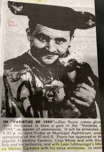 One young stage artist, Darrell Payne, was a veteran club comedian (“the man with the jumping eyes”), and a voice impersonator of screen and radio notables. He was known in the trade as “Don” Payne. Like many of his ilk, although he made a good living working in the endless theatres and nightclubs dotted across America, he remained mostly unknown as a name performer by the public. In one sense anonymity helped these “no-namers”: once they gained a reputation for being a “total pro” in, say, the role of a comic master of ceremonies with a solid reputation for getting big laughs, they were assured of constant employment, which enabled them to hone and fine-tune a tight, bulletproof act. Payne, who hailed from Wichita Falls in Texas, could dance, act in skits and had a solid standup act with “screwball antics and a winsome manner.” He also had that useful skill of being a multi-voiced imitator.