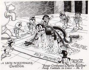 1936 was the year Bing became nationally famous in his high budgeted radio variety show, THE KRAFT MUSIC HALL. Many Warner cartoon buffs will recall a note in Jerry Beck’s and Will Friedwald’s indispensable 1989 book Looney Tunes and Merrie Melodies: in their entry on BINGO CROSBYANA they note how Bing’s attorneys didn’t find these parodies amusing (“’A potential threat to cartoon producers who caricature stars,’ was how The Hollywood Reporter [August 5, 1936] described the legal action. ‘The Crosby corporation has demanded that Warners cease distribution and exhibition of the reel. The demand states that the Crosby voice is imitated and the character of BINGO CROSBYANA is shown as a vainglorious coward.’”)