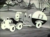 Trailer Thrills (5/3/37) – There seems to have been quite a vogue in cartoons about trailers, and the misadventures of trailer life. Terrytoons, Columbia, and later Disney all got into the act, so why not Lantz? It seems these primitive transportation methods were something of a status symbol – if you could afford one. It begins with Oswald singing an original James Dietrich composition, “Get a Trailer”. Oswald is in possession of a new car and trailer rig (both vehicles personified with facial features). A notable portion of the song lyric states: “You don’t have to pay a cent, to the landlord for the rent. You can even snub the gent – if you get a trailer,” Oswald reaches a road junction with two billboards pointing in different directions – one to the Sea Shore, and the other to Paradise Valley. While the trailer tugs at the car hitch to take the road heading for the sea, Oswald looks at a travel brochure for Paradise Valley, boasting of “Fishing- and how!”, and makes the choice of destinations against the trailer’s wishes. The car and trailer continue to have their differences, and Oswald faces a treacherous path up winding montain roads and over a “Dangerous Bridge – and we don’t mean maybe”, which collapses under them. Oswald and the trailer barely stay on one wheel upon a spiraling road downhill, finally landing in the valley, to find that the travel brochures are woefully out of date, as the entire lake is now a dry river bed. As Oswald takes in this distressing sight, the trailer whacks him on the head with its fender as if to say, “I told you so”, while Oswald performs ballerina steps in a cockeyed daze.