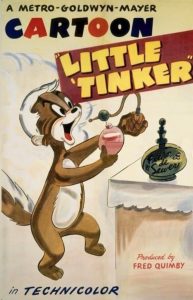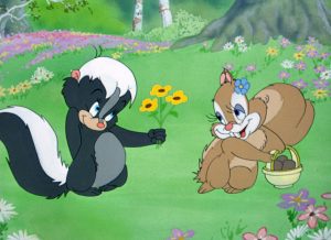 Little ‘Tinker (MGM, 6/15/48 – Tex Avery, dir.) – The Sinatra influence continued, and we couldn’t go without mentioning yet another out-of-place individual caught up in its wake – a little guy by the name of B. O. Skunk, resident of 123 Limburger Lane, who lives in a tall tree where every windowed trunk hole ventilates the interior air with electric fans. B. O. is meticulous in his hygiene, bathing in O-Bouy soap, washing his hair in Shampew, and adding the final touch of cologne (brand name Fleur De Sewer). Yet, all he has to do is walk out his door, and the flowers all wilt on both sides of his walkway. This kind of critter is definitely a longshot for having any attraction to the ladies of the forest, and, no matter what species they may be, all the womenfolk of the woods greet him with a sniff, a scream, and a retreat. Even an old maid rabbit in dire search for “a man” retreats in the same way after one whiff.