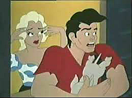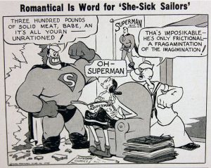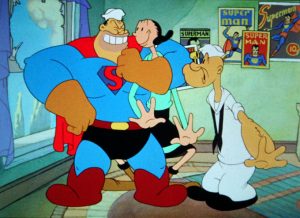 She-Sick Sailors (Paramount/Famous, Popeye, 12/8/44 – Seymour Kneitel,.dir.) – As mentioned above, Popeye is pretty super-human. But can he match the stuff of a strange visitor from another planet? Olive seems to lean toward the latter, as she has taken up reading Superman comics, and swoons at his every act of derring-do, ignoring her powerful boyfriend as if a has-been. Bluto overhears the bickering between them in Olive’s apartment, and sees an opening to get in good with Olive. For one of the few times in his screen career (though the “unkindest cut of all” is not actually witnessed on screen), Bluto shaves off his whiskers (though leaving a visible “5 o’clock shadow”), and rents a set of blue tights and red cape in a somewhat portly size range. While Popeye engages in a heated game of “keep-away” by concealing Olive’s comic book behind his back, an oversize “amazing stranger” bursts through the wall to defend the lady’s honor, dealing Popeye a blow to the chops that crashes him into Olive’s sofa. Blutoman tells Olive he’ll stick to her like glue, and Olive replies with a giggle, “The feeling is mucilage.” Popeye, with his head springing out of the sofa cushions, is shocked. “Well, blow me down. If he ain’t a real humane being!” However, Popeye is as usual up to the challenge, addressing Bluto as “Stupidman”, and insisting that he has to prove he’s the better man than the sailor. “All right, you milk muscled midget, let’s see if you can save the fair damsel”, says Bluto, casually dropping Olive from a window 20 stories above ground. (Makes one wonder how Bluto managed to break through the wall at such a height.) “Wow!”, shouts Popeye, and begins racing at his fastest speed down flight after flight of stairs. Bluto instead uses gravity for speed (of course taking nothing into account as to how he can possibly fall faster than Olive so as to catch up with her), and jumps out the window himself. Miraculously, he does overtake Olive, then pops an umbrella out of the back of his shirt, tied by its handle to his waist, floating the two of them gently to the ground. When Popeye arrives, catcher’s mitt in hand, he merely runs himself in circles into a pretzel knot, looking upwards for someone to save – as Bluto and Olive are already on the ground, laughing at his hapless effort. (A notable continuity error commences from this point in the cartoon, as the “S” insignia on Bluto’s chest disappears entirely for the remainder of the picture once he reaches the ground.) Popeye sighs, “I’m flabberblasted!”
