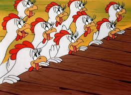 Swooner Crooner (Warner, Porky Pig, 5/6/44 – Frank Tashlin, dir.) – As if production demands weren’t tough enough on cartoon hens in the past, Porky Pig really kicks things into high at his “Flockheed Eggcraft Factory” – dedicated to 100% war work. Now the hens don’t get ro merely sit in their comfy box nests on the wall, but punch time clocks, and take their place on a massive line of conveyor belts, where there nests pass over the production area and the hens deliver their “output” through bomb bay doors into the boxing machinery – sometimes in singles, sometimes in dozens of eggs at once. Only one thing can grind the efficiency of this operation to a halt – the number 1 heartthrob of any 40’s bobby-soxer – FRANKIE! A pencil-thin crooning rooster, parodying the youthful image of the great Sinatra, swoons the ladies for a loop, and causes them to abandon their posts, until Porky finds nothing in the nests but signs reading “Absentee”, and others reading “Ditto”. Outside, he witnesses the source of the trouble, and the effect – an entire farmyard of hens fainted dead away.