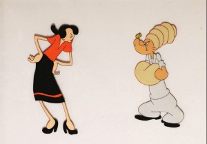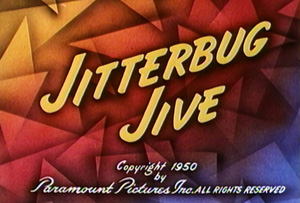 Jitterbug Jive (Famous/Paramount, Popeye, 7/23/50 – Bill Tytla. dir,) – Long after Tom the Cat’s zoot suit had probably shrunk to nothing. Popeye and Bluto get with the scene – though perhaps not as memorably. Olive is hosting a party, expecting to beep and bop and blow her top with Popeye and Bluto. Popeye arrives first, his arms full of boxes of “parlor games” to liven up the affair. Unfortunately, Popeye is today in his most backwards and antiquated mode, beginning by setting the mood for the festivities with a record of a corny arrangement of a Strauss waltz, and suggesting an opening activity of pulling taffy. A knock at the door allows Olive a chance to exit this sticky situation, allowing the taffy to snap back at Popeye, entwining around his head like a swami’s turban. At the door, we find the “new” Bluto, decked out in a new zoot suit, and in another of his rare occasions, almost clean-shaven, this time leaving a thin moustache, and still with a trace of five o’clock shadow. Bluto slips Olive some skin, and declares. “Let’s get the jernt jumpin’.” Bluto sets himself at an upright piano, and starts pounding out some boogie beats on the ‘88. When Popeye asks who invited him to the party, Bluto remarks at Popeye, “The ol’ cornball himself.” Giving a tug at Popeye’s taffy, Bluto allows the stuff to snap back at Popeye again, driving him into a window-box alcove in the wall, Popeye assuming the alcove’s shape. “What a square!”, chortles Bluto at the sight.