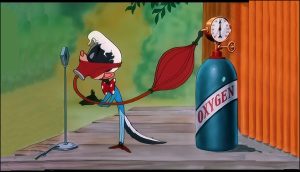 Dan Cupid shows up – but has to make a brief retreat to don a protective gas mask. He hands B. O. a booklet with sure-fire advice on how to get a girl, entitled “Advice to the Love-Worn”, by Beatrice Bare Fax. B. O. follows the advice of several chapters, including a Charles Boyer impersonation, a Romeo and Juliet-style balcony serenade, and finally, a chapter illustrated by a caricature of Frank Sinatra, entitled, “Swoon ‘Em”. Donning a costume labeled “One Frankie suit”. B. O. tightens his waistline until he is pencil-thin behind a bow tie, then steps out onto a forest stage, to perform a full arrangement of Sinatra’s early hit, “All Or Nothing At All”.(though his sheet music bears the title, “Rhapsody in Pew”). An extended (and most memorable) sequence tops even the gags of “Swooner Crooner”, with collapses of the weaker sex to the music, and libido-driven displays of romantic emotion rivaling the wolf’s reactions to Red in “Red Hot Riding Hood”. B. O. meanwhile lampoons the skinniness and seeming weakness of Sinatra, being measured by an undertaker during his performance, and finishing part of his number by performing while encased in an iron lung. The fans finally mob the stage, planting kisses everywhere – but once within smelling range, everyone retreats again, leaving B.O. alone with a stage full of lip-prints.