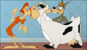 Little Rural Riding Hood (MGM, 9/17/49 = Tex Avery, dir.) – The tale of the country mouse and the cty mouse had been kicking around in cartoons for years, and had already won Disney an Oscar in the mid-thirties. But the Country Wolf and the City Wolf was Avery’s new twist. Of course, what do wolves do in Avery cartoons when they’re not chasing pigs or sheep? Chase girls! However, there’s a lot of differences in style and taste between the country and city varieties. The Country Wolf (voiced by Pinto Colvig) pulls the old routine as Red Riding Hood’s “Grandma” to get within reach of a freckle-faced, no figure, skinny as a rail lumpkin of a female who is the country version of Red, with the intent not to steal her basket of goodies, but to kiss her, and hig her, and love her. Country Red, however slow-witted she may outwardly appear, is fleet of foot, and leads the wolf on a merry chase through the house, including Avery’s oft-used unhinged door gag that opens a new pathway for chasing anywhere it lands, and a mistaken lunge for Red by the wolf that results in him kissing a cow. The wolf finally gets Country Red in his arms, and Red is about to succumb, painting her lips with lipstick and settling back for the nevitabe smooch – when a telegram s delivered to the wolf. It is from his city cousin, who boasts, “Quit wasting your time on that country gal. Come to the big city, and I’ll show you a REAL Red Riding Hood.” A photo is enclosed – of the Red we know and love from Avery’s original “Red Hot Riding Hood”. Country Wolf’s eyes bug out, in the manner that only an Avery character can do. When Country Red still insists, “Kiss me, my fool”, Country Wolf leaves her kissing the cow, and zooms off as fast as his old jalopy will carry him to the big city.