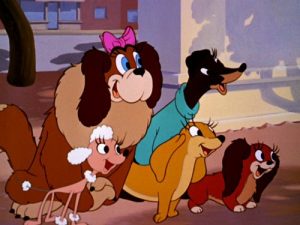 For our final sequence, Pluto reappears out the door of his doghouse, again giving us his secretive wink. He opens his mouth, and the sounds of a vocal impersonation of Frank Sinatra fill the air, crooning a version of the hit love song from “The Three Caballeros”. “You Belong To My Heart”. The birds, bee, and cricket all sit up and take notice, nodding between themselves in approval of Pluto’s new musical ability. What’s more, all the neighborhood female dogs gather at the gate, and begin to sigh and swoon at every love line in the lyric. Pluto does a well-timed lip-sync, and adapts his facial features to emote his lines with feeling. a la ol’ blue eyes. The jig is almost up when the record sticks on the word “belong” inside his doghouse, but Pluto reshifts his tail to avoid the skip just in time, and completes the number without giving his trick away, as the female dogs all fall backwards un a swooning faint. Pluto gives a Sinatra smile to the camera, for the iris out. Nominated for an Academy Award.